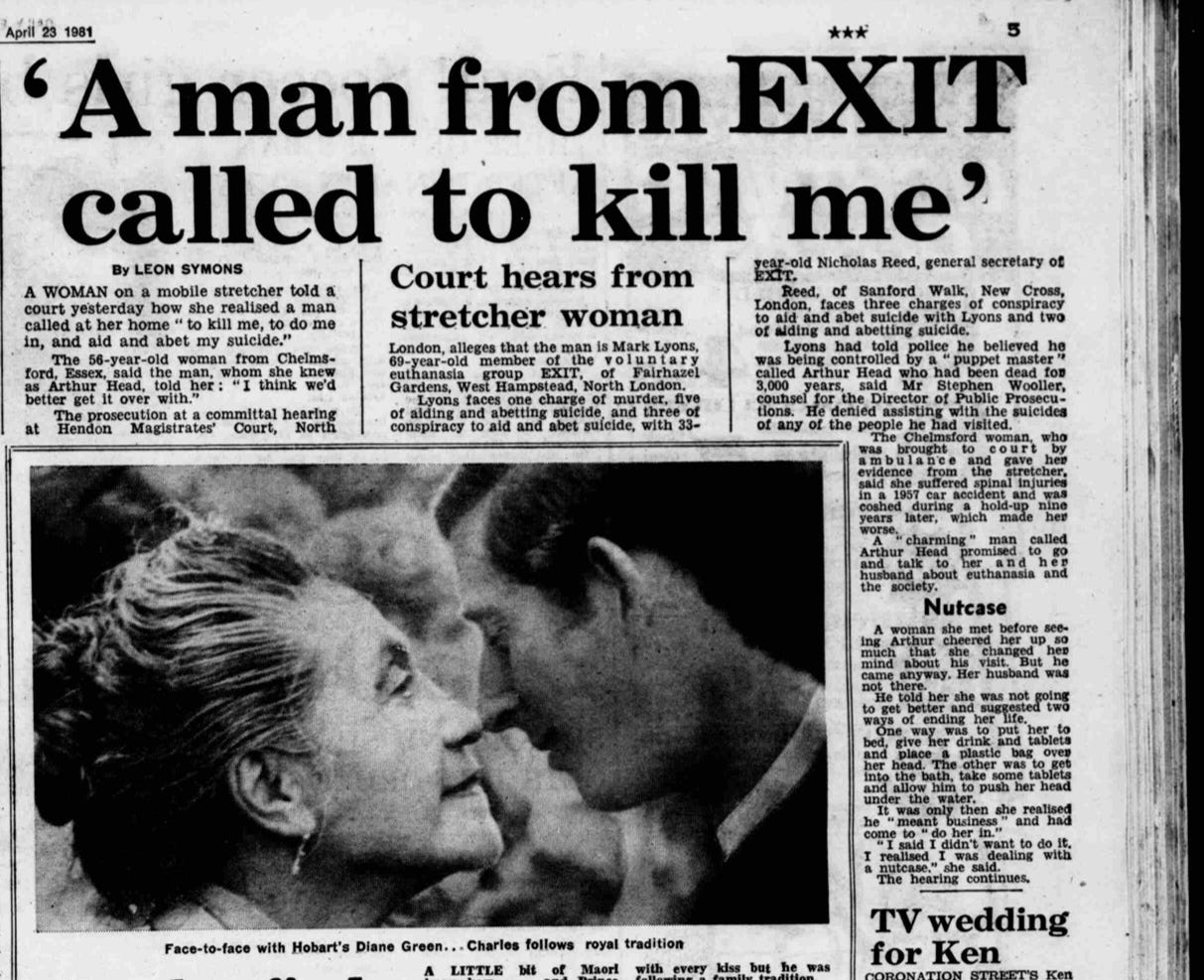 EXIT rebranded quickly after Reed’s imprisonment, first to the Voluntary Euthanasia Society (its longtime name) and then to Dignity in Dying in the 2000s. It maintained renewed focus on the terminally ill, although as the 1980s continued that seemed to include a wide range of disabilities like multiple sclerosis, and people who’d suffered a stroke.