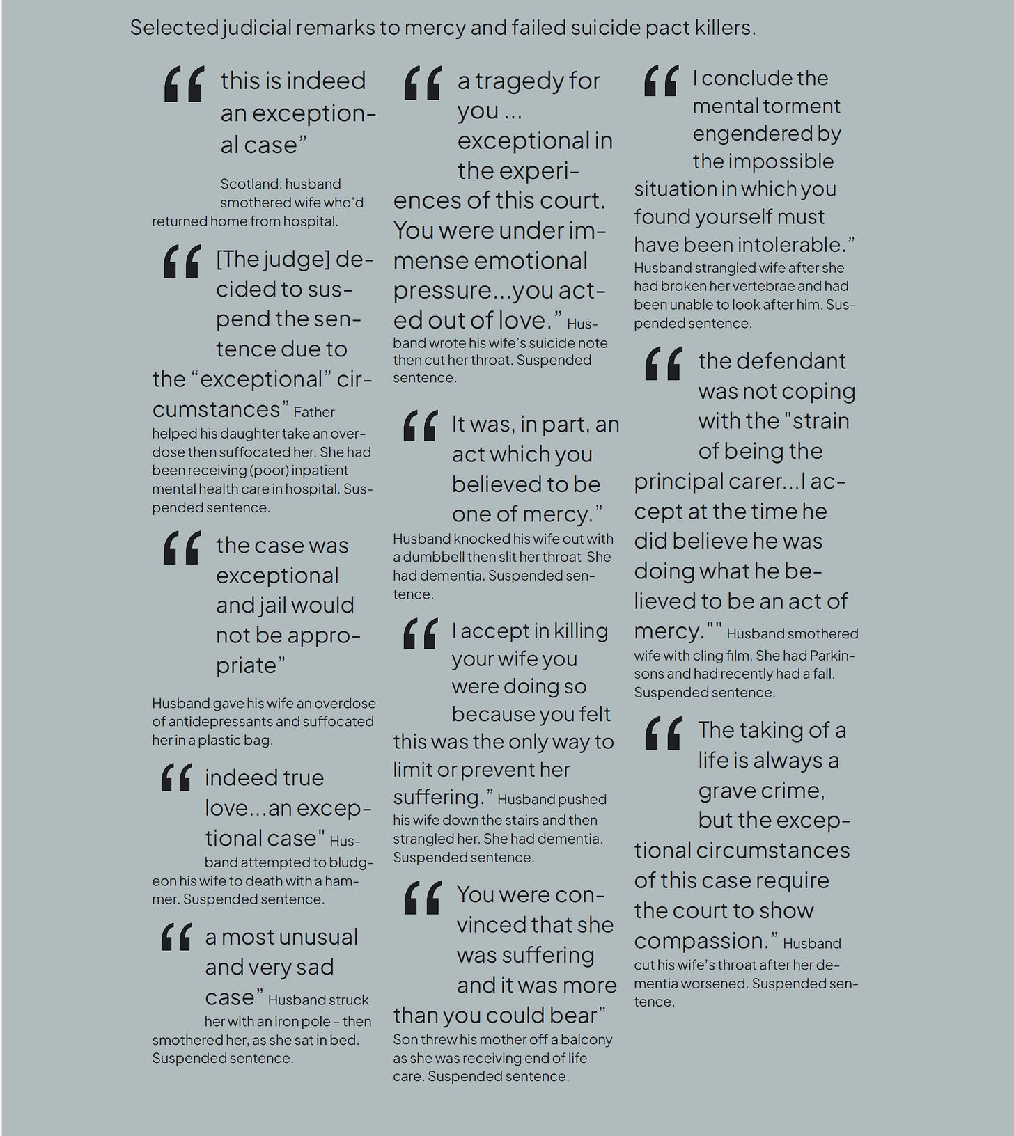 Much of the system’s response to Robert Hunter became the norm: now, up to one British man every month kills a woman who was not terminally ill nor asking to die, instead elderly, infirm, disabled. The killing is seemingly triggered by escalating care needs: sometimes it is time for her to need to go into a home. The violence used to kill can be extreme, ‘overkill’. The men are prosecuted but usually allowed to plead guilty to manslaughter by diminished responsibility.