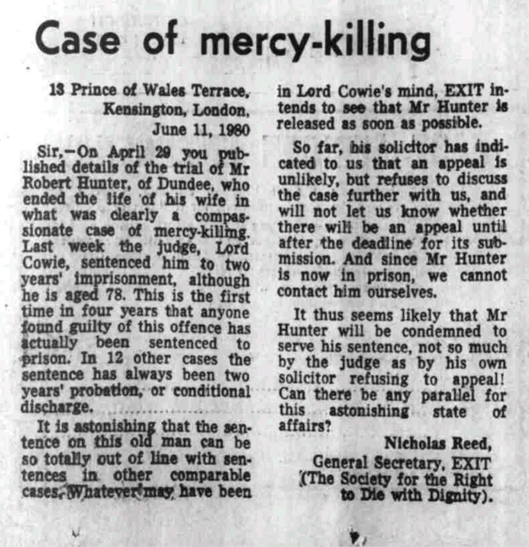 “Mr Robert Hunter of Dundee, who ended the life of his wife in what was clearly a compassionate case of a mercy-killing… This is the first time in 4 years that anyone found guilty of this offence has actually been sentenced to prison. In 12 other cases the sentence has always been 2 years probation, or conditional discharge… EXIT intends to see that Mr Hunter is released as soon as possible.”