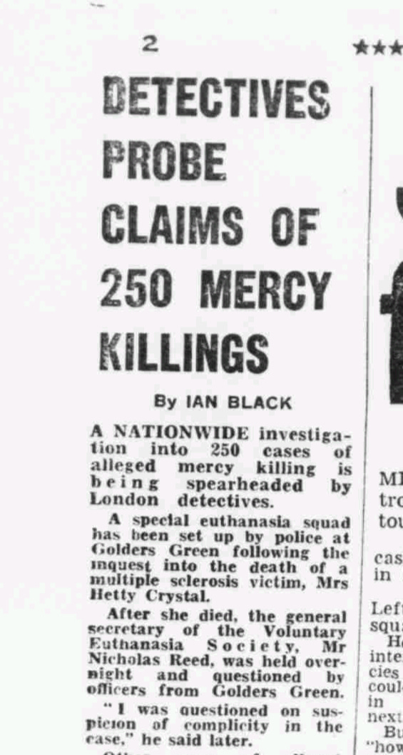 A few weeks after Nicholas Reed wrote glibly of Robert Hunter’s ‘compassion’, the Daily Express reported on a shocking police investigation. Nicholas Reed and another man were being investigated for being involved in the deaths of 250 people. London detectives had set up a ‘special euthanasia squad’ to investigate.